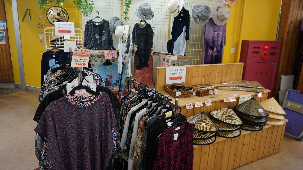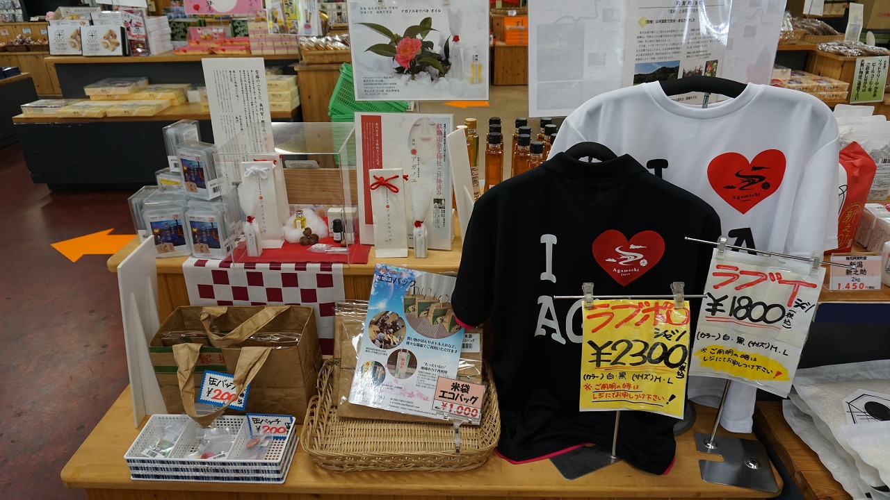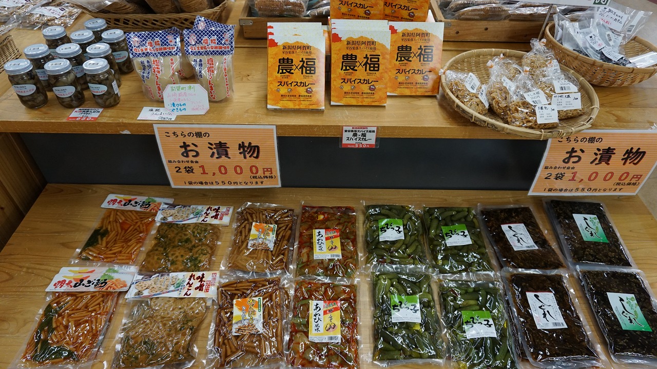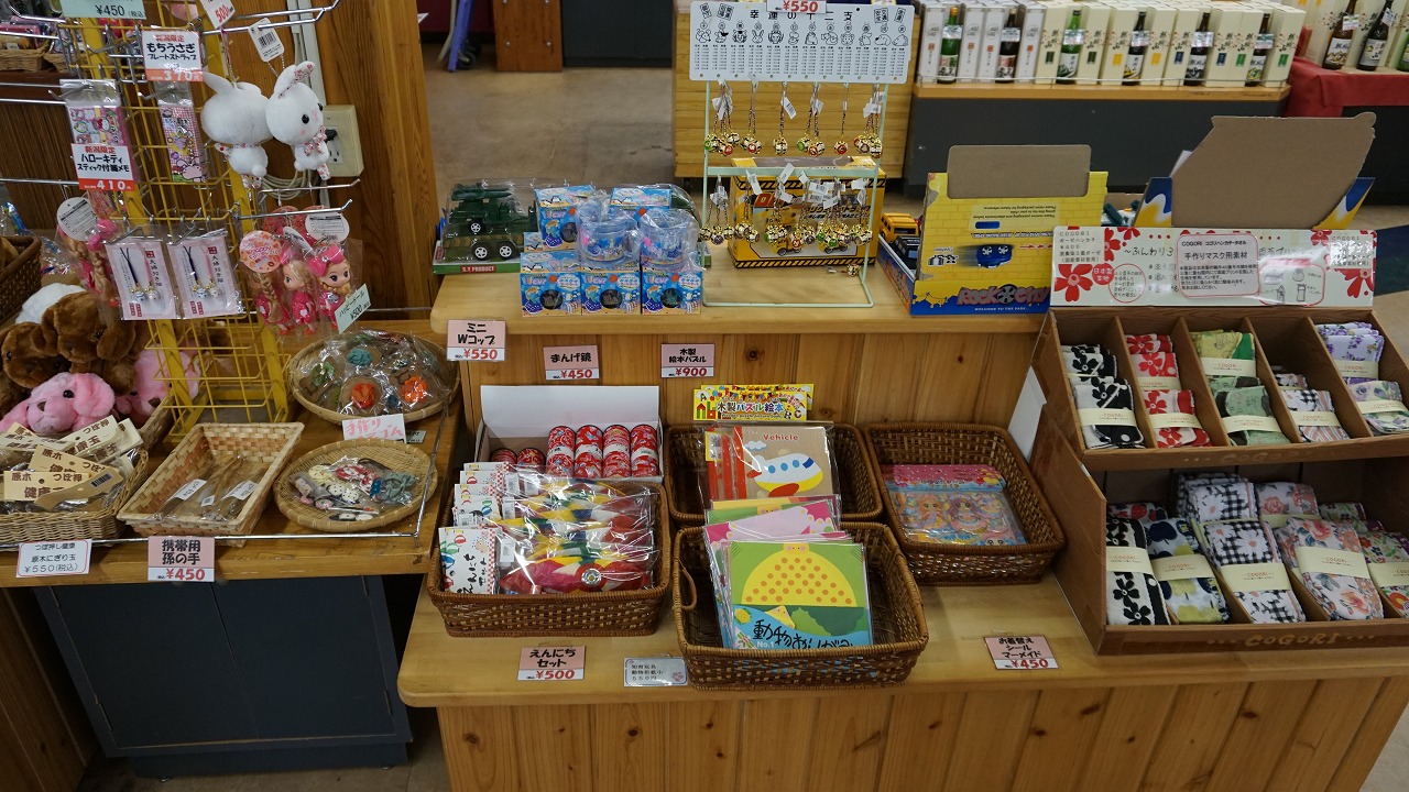 阿賀町産の新鮮な野菜が並んでおり、おしゃれTシャツと婦人服、子供へのおみやげとしておもちゃも買うことができます。