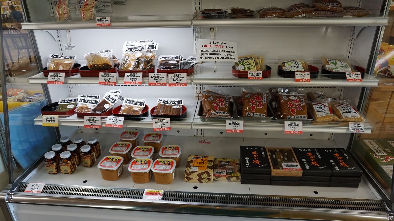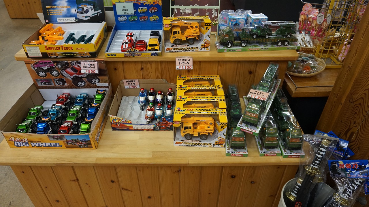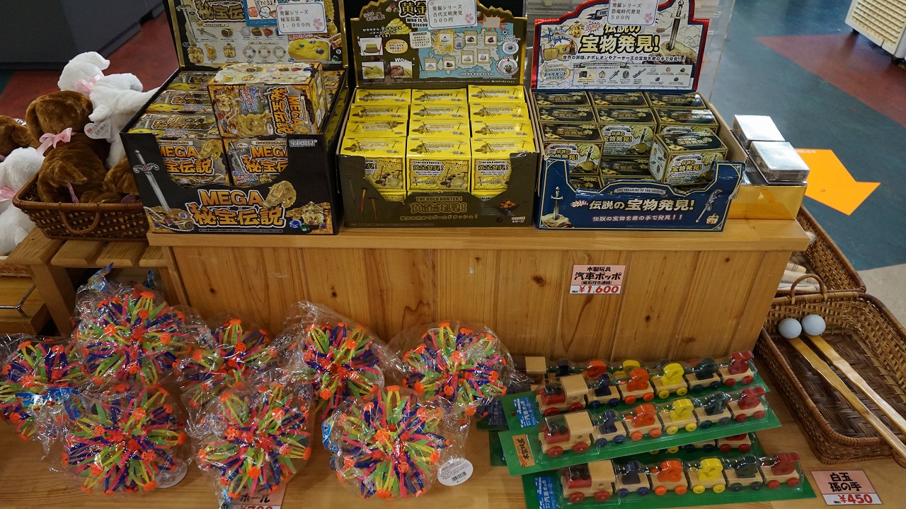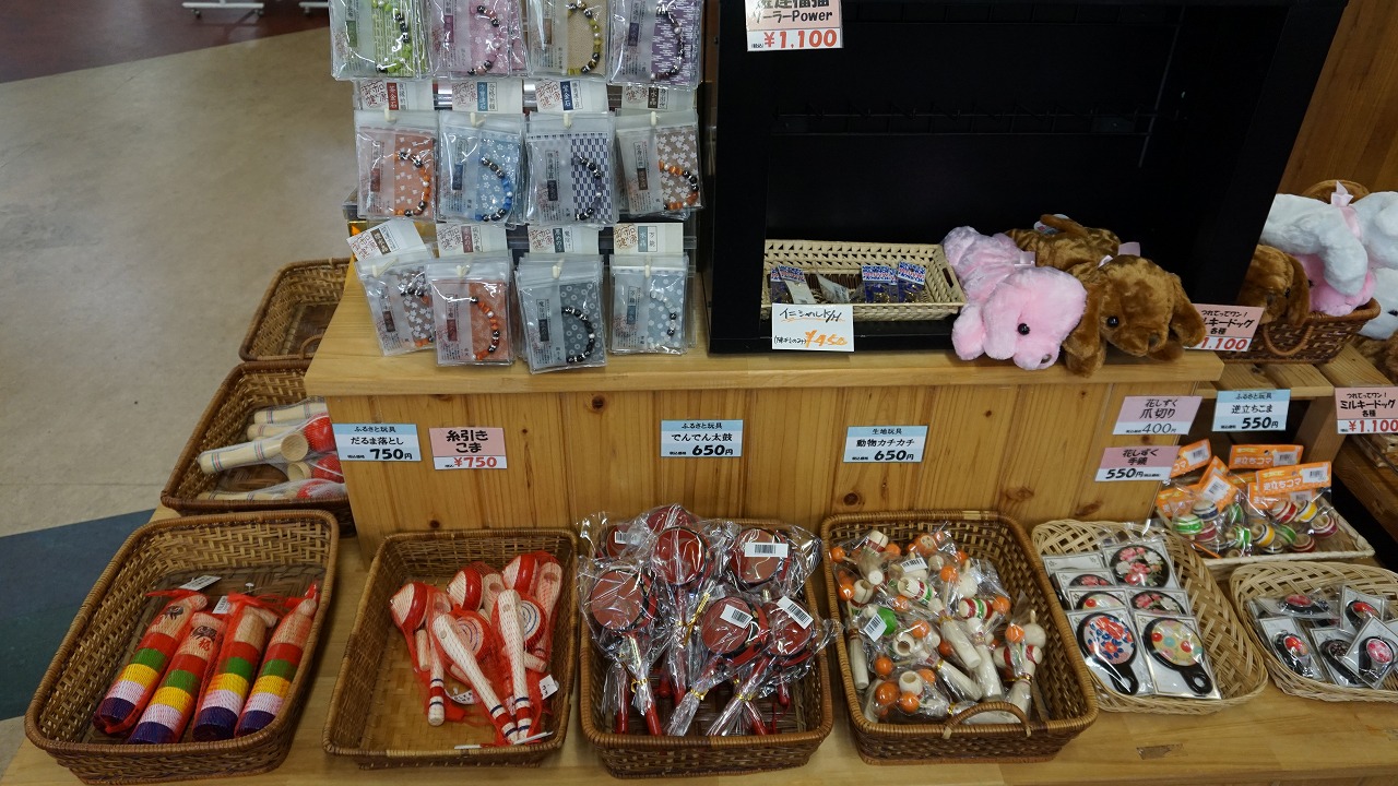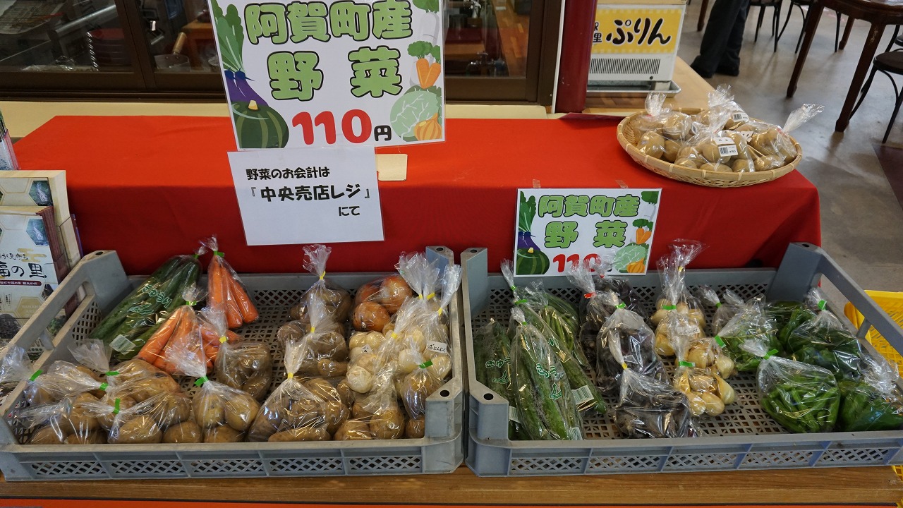 阿賀町産の新鮮な野菜が並んでおり、おしゃれTシャツと婦人服、子供へのおみやげとしておもちゃも買うことができます。